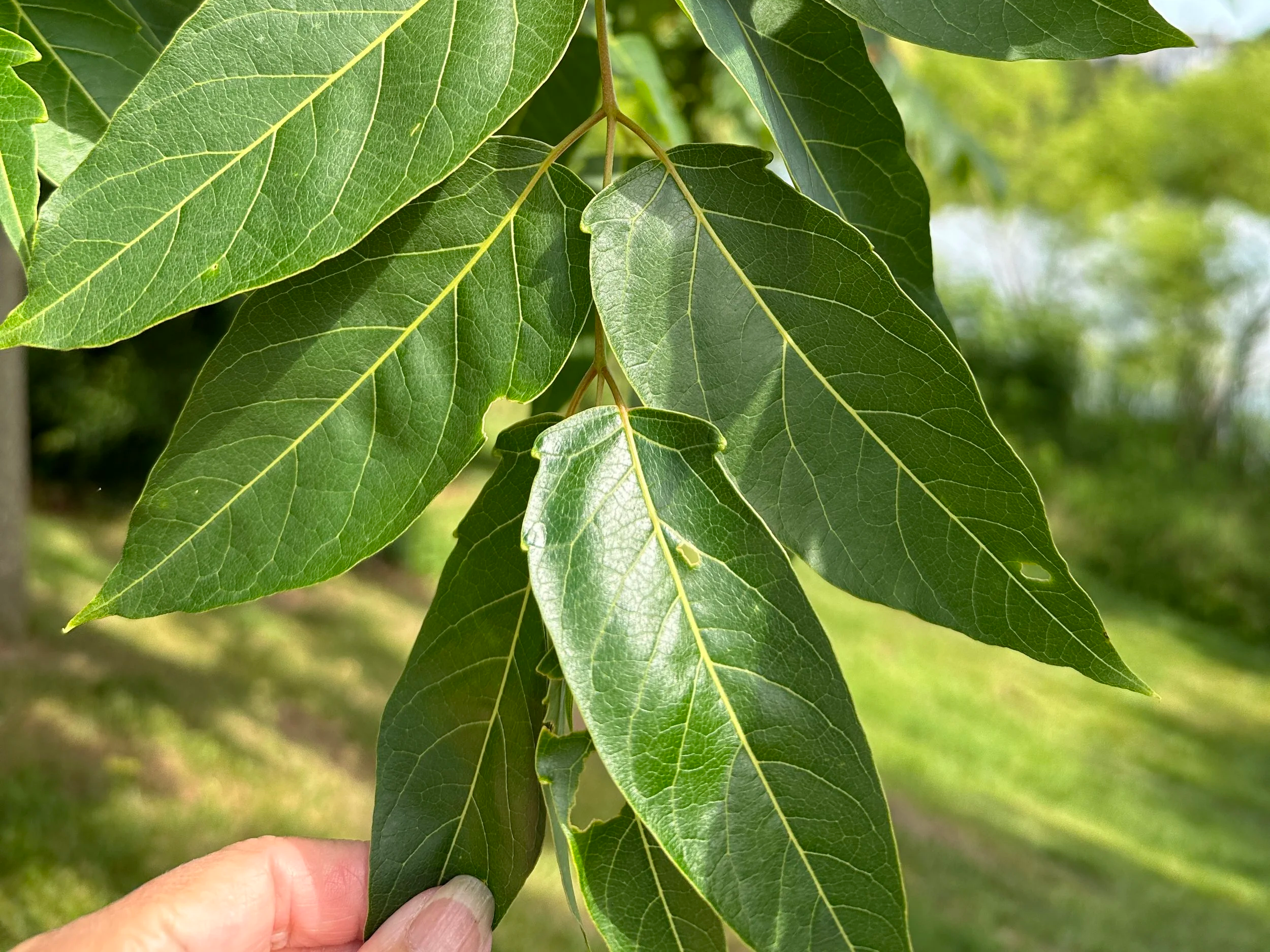 Hojas: Sus hojas, de textura gruesa y forma de pluma, miden entre 30 y 120 cm de largo y están compuestas por entre 11 y 41 foliolos con un foliolo terminal. Las hojas se alternan a lo largo de ramas robustas y los foliolos también se disponen de forma alterna a lo largo del nervio central. Los bordes de los foliolos son lisos, excepto por una o más muescas pequeñas («pulgares») cerca de sus bases. En estas muescas se observan pequeñas protuberancias o glándulas, lo que resulta útil para realizar una identificación precisa.
